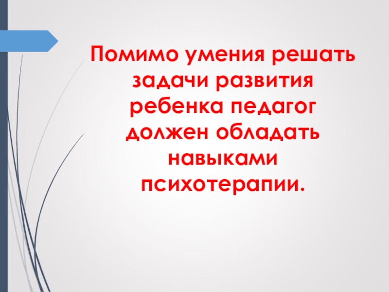 Слайд 4Помимо умения решать задачи развития ребенка педагог должен обладать навыками психотерапии.