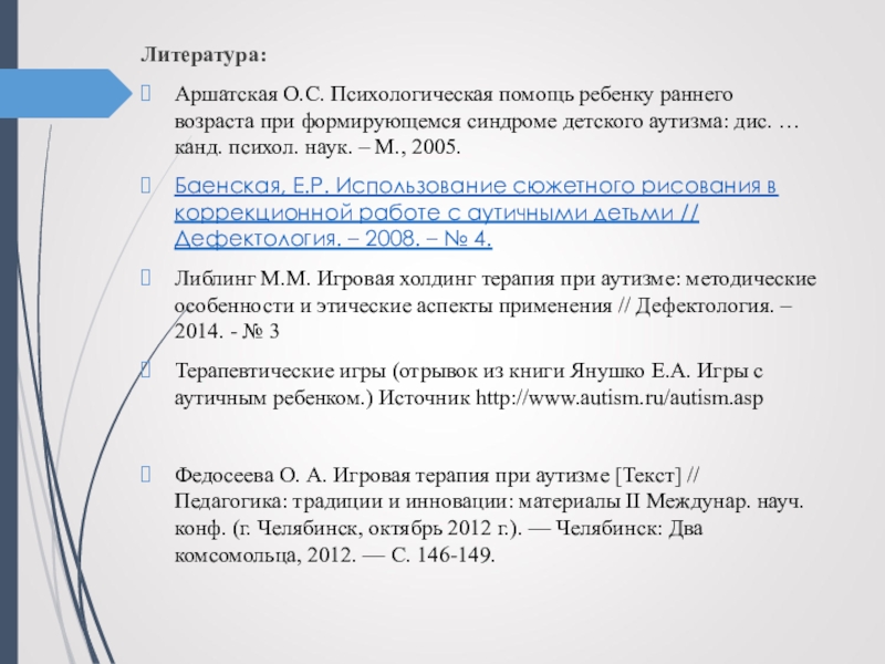 Федосеева О. А. Игровая терапия при аутизме [Текст] // Педагогика: традиции и инновации: материалы II Междунар. науч. конф. (г. Челябинск, октябрь 2012 г.). — Челябинск: Два комсомольца, 2012. — С. 146-149.