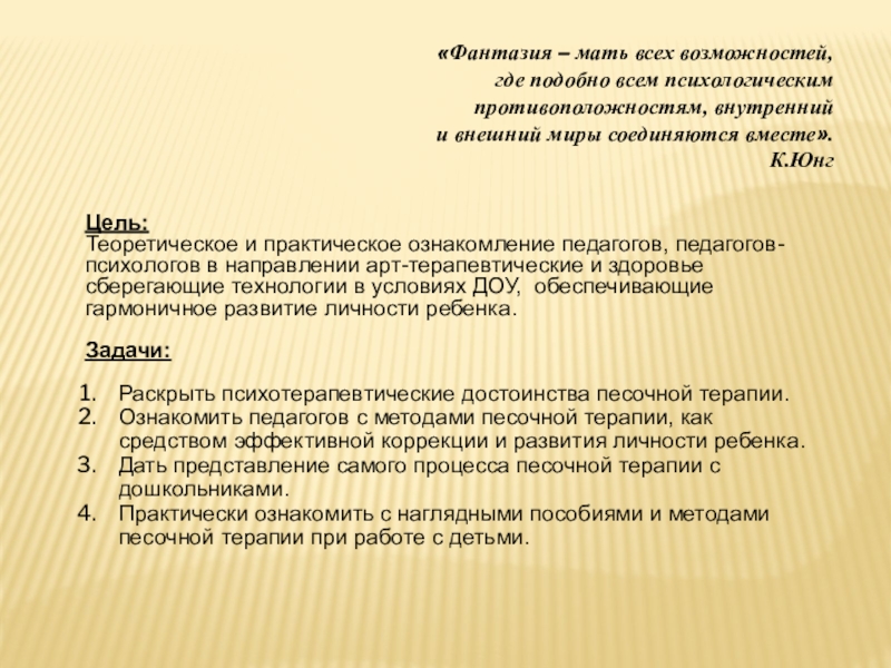Ознакомить педагогов с методами песочной терапии, как средством эффективной коррекции и развития личности ребенка.