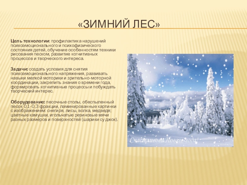Оборудование: песочные столы, обеспыленный песок 0,1-0,3 фракции, ламинированные картинки с изображением: снегиря, лисы, волка, медведя; цветные камушки, игольчатые резиновые мячи разных размеров и поверхностей (шарики су джок).