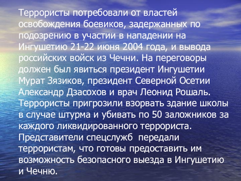 в нападении на Ингушетию 21-22 июня 2004 года, и вывода российских войск из Чечни. На переговоры должен был явиться президент Ингушетии Мурат Зязиков, президент Северной Осетии Александр Дзасохов и врач Леонид Рошаль. Террористы пригрозили взорвать здание школы в случае штурма и убивать по 50 заложников за каждого ликвидированного террориста. Представители спецслужб передали террористам, что готовы предоставить им возможность безопасного выезда в Ингушетию и Чечню.