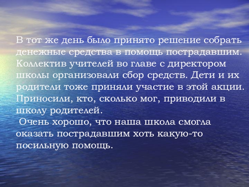 помощь пострадавшим. Коллектив учителей во главе с директором школы организовали сбор средств. Дети и их родители тоже приняли участие в этой акции. Приносили, кто, сколько мог, приводили в школу родителей. Очень хорошо, что наша школа смогла оказать пострадавшим хоть какую-то посильную помощь.