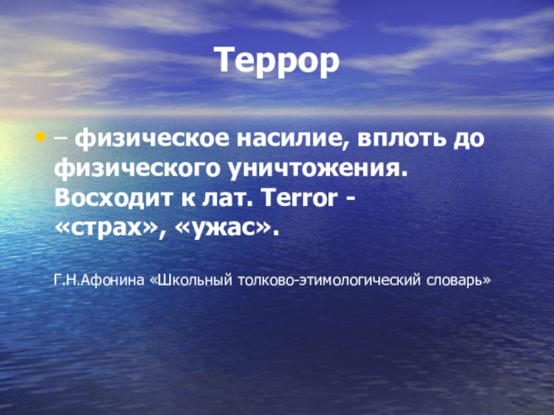 Террор– физическое насилие, вплоть до физического уничтожения. Восходит к лат. Terror - «страх», «ужас». Г.Н.Афонина «Школьный толково-этимологический словарь»