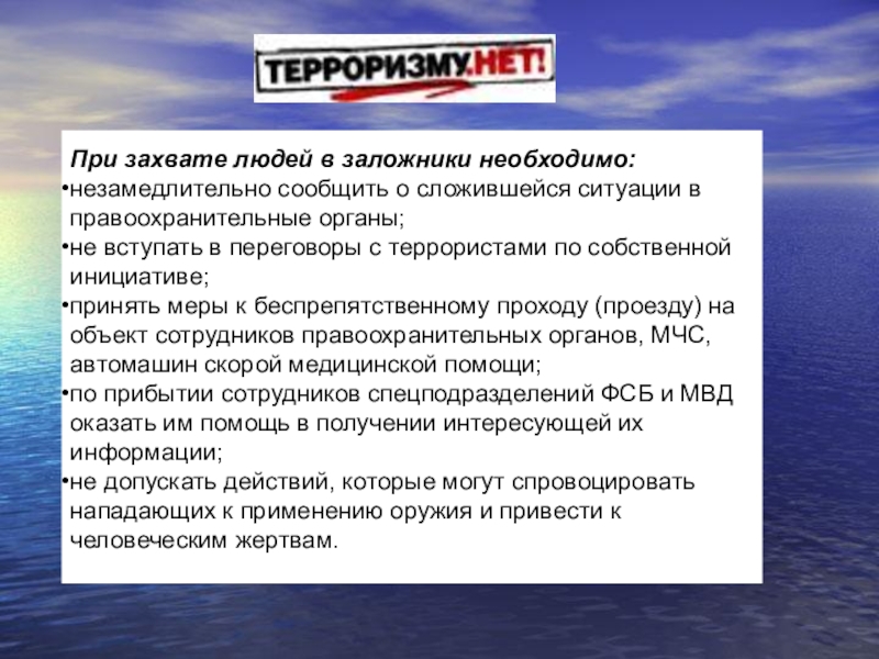 При захвате людей в заложники необходимо: незамедлительно сообщить о сложившейся ситуации в правоохранительные органы;не вступать в переговоры