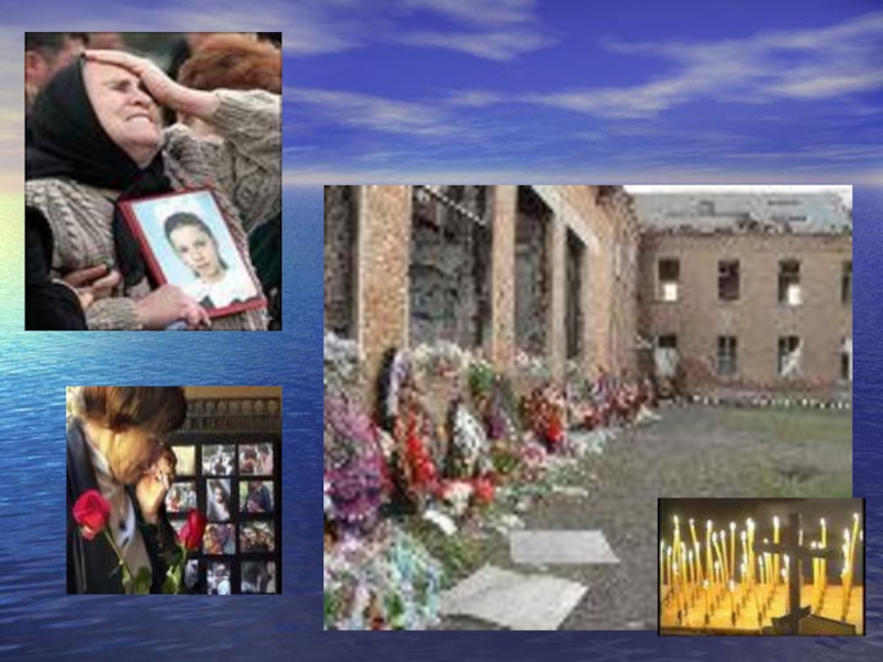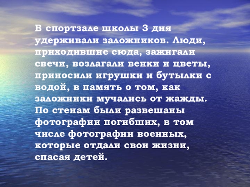 Слайд 13В спортзале школы 3 дня удерживали заложников. Люди, приходившие сюда, зажигали