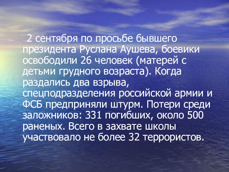 освободили 26 человек (матерей с детьми грудного возраста). Когда раздались два взрыва, спецподразделения российской армии и ФСБ предприняли штурм. Потери среди заложников: 331 погибших, около 500 раненых. Всего в захвате школы участвовало не более 32 террористов.