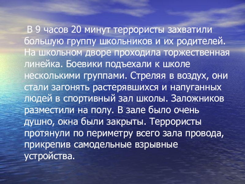 школьников и их родителей. На школьном дворе проходила торжественная линейка. Боевики подъехали к школе несколькими группами. Стреляя в воздух, они стали загонять растерявшихся и напуганных людей в спортивный зал школы. Заложников разместили на полу. В зале было очень душно, окна были закрыты. Террористы протянули по периметру всего зала провода, прикрепив самодельные взрывные устройства.