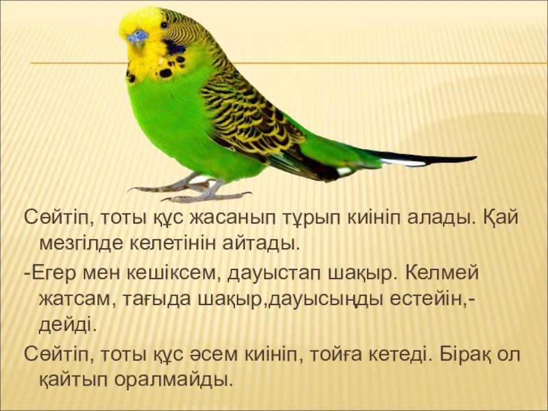 Слайд 6 Сөйтіп, тоты құс жасанып тұрып киініп алады. Қай мезгілде келетінін