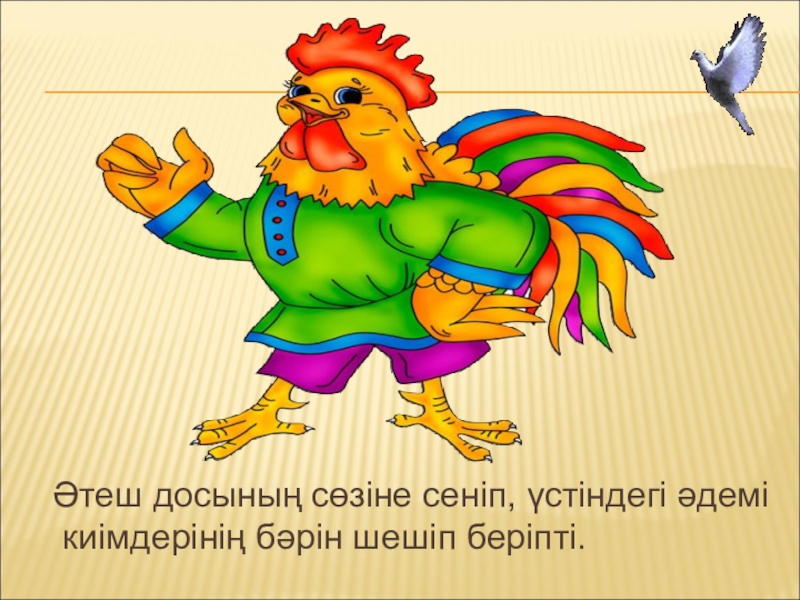 Слайд 5 Әтеш досының сөзіне сеніп, үстіндегі әдемі киімдерінің бәрін шешіп беріпті.