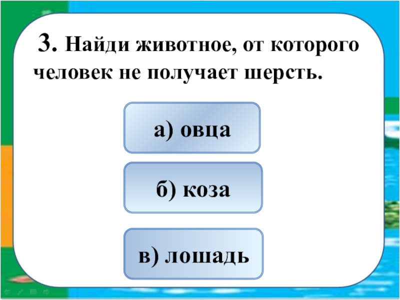 в) коза, овца, осёл, лошадь