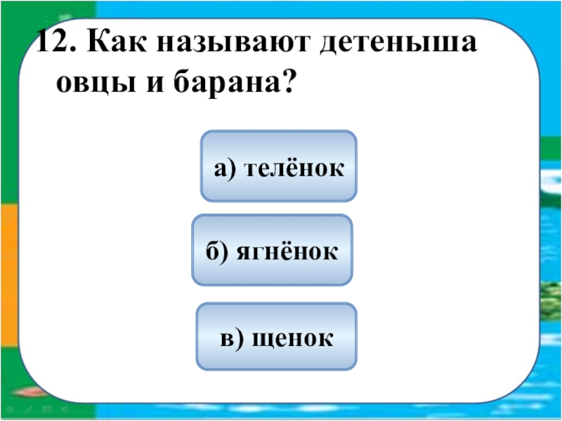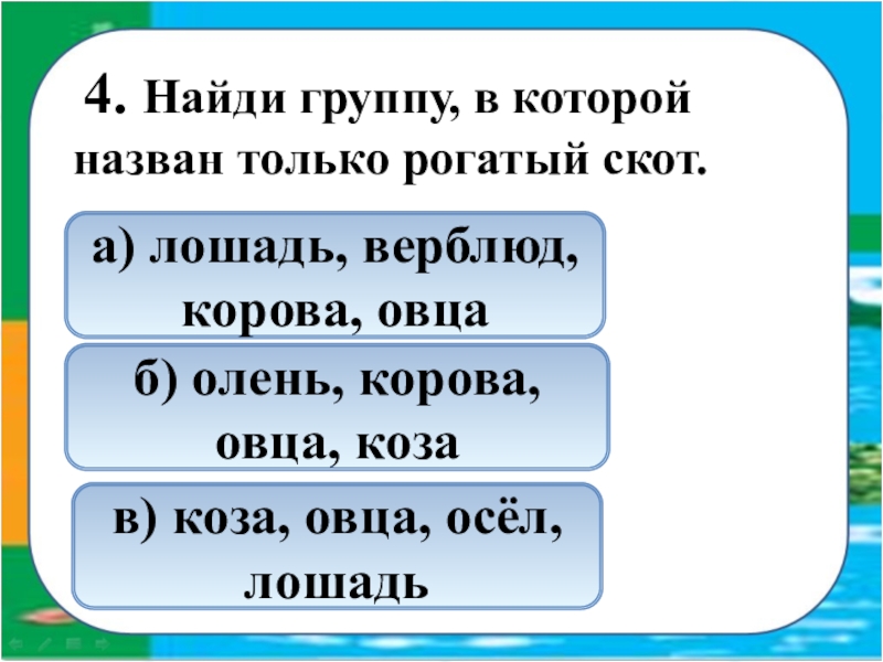 а) лошадь, верблюд, корова, овца