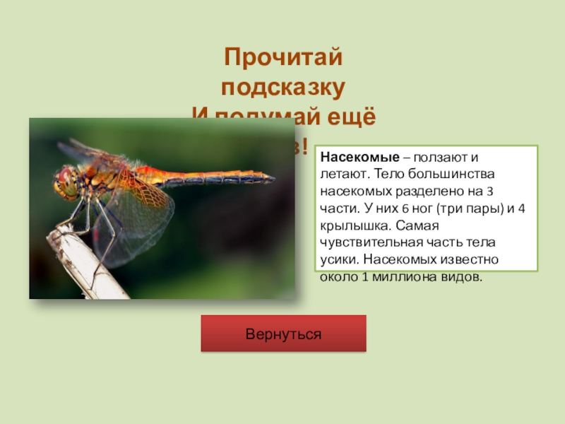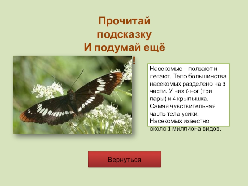 большинства насекомых разделено на 3 части. У них 6 ног (три пары) и 4 крылышка. Самая чувствительная часть тела усики. Насекомых известно около 1 миллиона видов.
