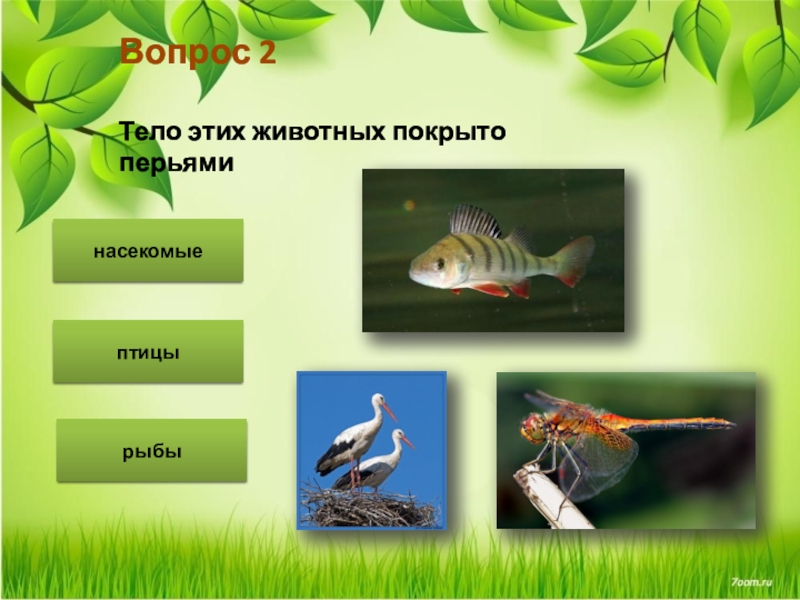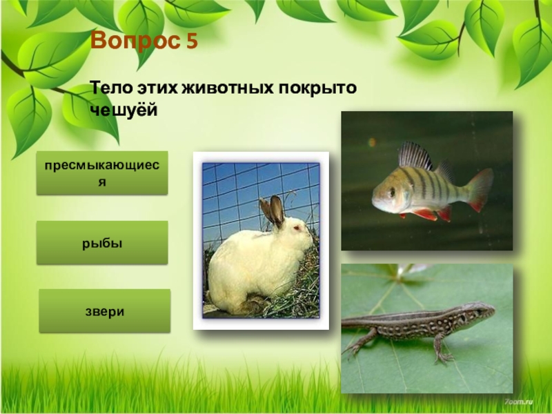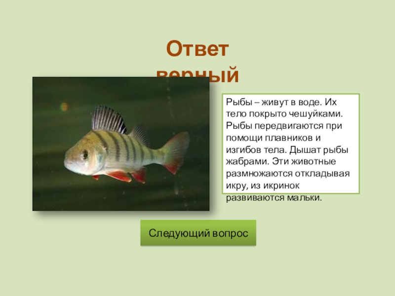 Рыбы – живут в воде. Их тело покрыто чешуйками.
