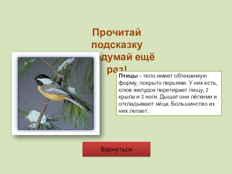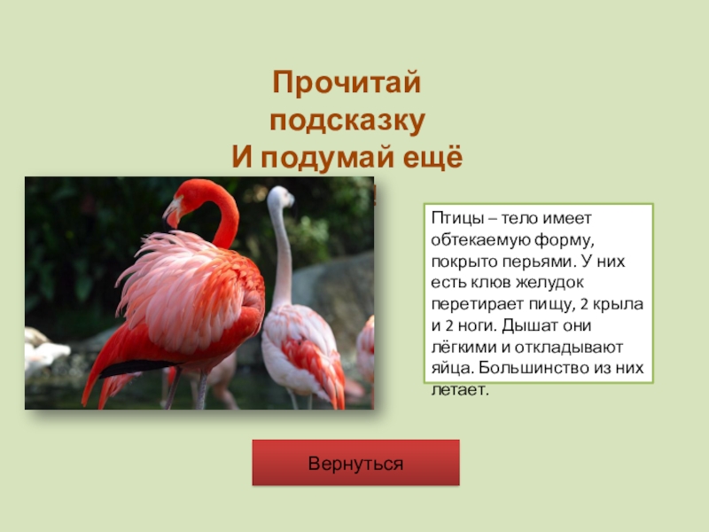 покрыто перьями. У них есть клюв желудок перетирает пищу, 2 крыла и 2 ноги. Дышат они лёгкими и откладывают яйца. Большинство из них летает.