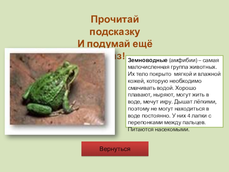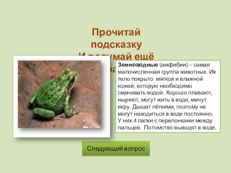 группа животных. Их тело покрыто мягкой и влажной кожей, которую необходимо смачивать водой. Хорошо плавают, ныряют, могут жить в воде, мечут икру. Дышат лёгкими, поэтому не могут находиться в воде постоянно. У них 4 лапки с перепонками между пальцев. Потомство выводят в воде.