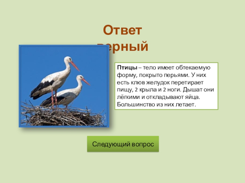 покрыто перьями. У них есть, клюв желудок перетирает пищу, 2 крыла и 2 ноги. Дышат они лёгкими и откладывают яйца. Большинство из них летает.