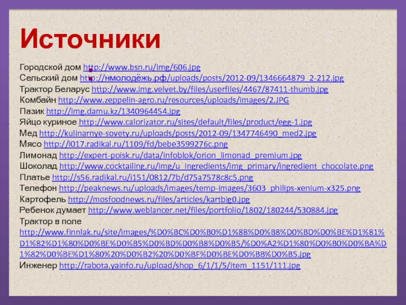 Источники: Городской дом http://www.bsn.ru/img/606.jpgСельский дом http://нмолодёжь.рф/uploads/posts/2012-09/1346664879_2-212.jpgТрактор Беларус http://www.img.velvet.by/files/userfiles/4467/87411-thumb.jpg Комбайн http://www.zeppelin-agro.ru/resources/uploads/images/2.JPGПазик http://img.damu.kz/1340964454.jpgЯйцо куриное http://www.calorizator.ru/sites/default/files/product/egg-1.jpgМед http://kulinarnye-sovety.ru/uploads/posts/2012-09/1347746490_med2.jpgМясо http://i017.radikal.ru/1109/fd/bebe3599276c.pngЛимонад http://expert-poisk.ru/data/infoblok/orion_limonad_premium.jpgШоколад http://www.cocktailing.ru/img/u_ingredients/img_primary/ingredient_chocolate.pngПлатье