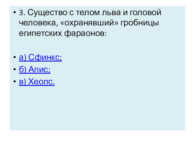 3. Существо с телом льва и головой человека, «охранявший» гробницы египетских фараонов:а) Сфинкс;б) Апис;в) Хеопс.