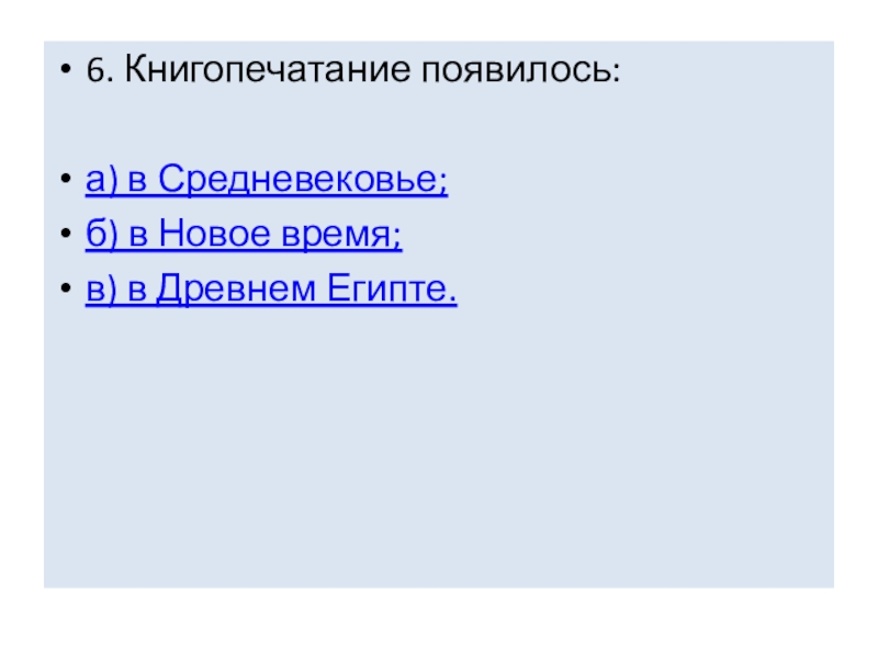 6. Книгопечатание появилось:а) в Средневековье;б) в Новое время;в) в Древнем Египте.
