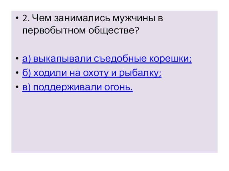 2. Чем занимались мужчины в первобытном обществе?а) выкапывали съедобные корешки;б) ходили на охоту и рыбалку;в) поддерживали огонь.