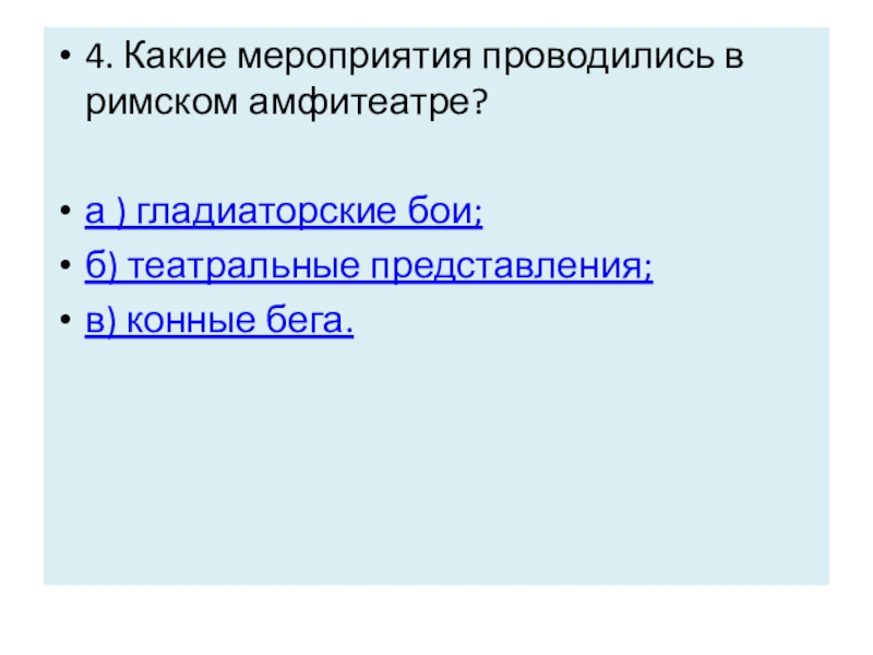 4. Какие мероприятия проводились в римском амфитеатре?а ) гладиаторские бои;б) театральные представления;в) конные бега.
