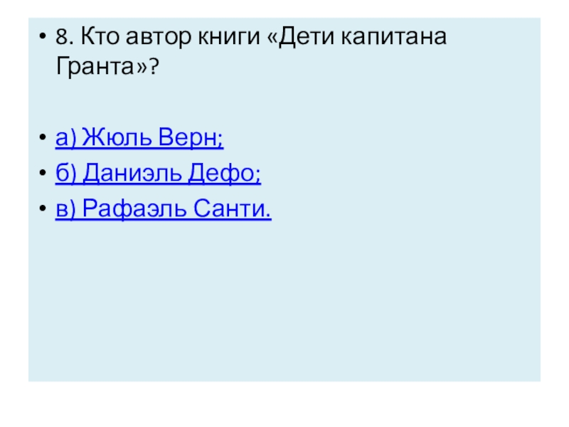 8. Кто автор книги «Дети капитана Гранта»?а) Жюль Верн;б) Даниэль Дефо;в) Рафаэль Санти.