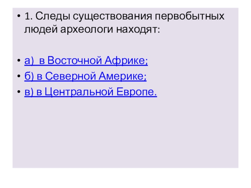 1. Следы существования первобытных людей археологи находят:а) в Восточной Африке;б) в Северной Америке;в) в Центральной Европе.