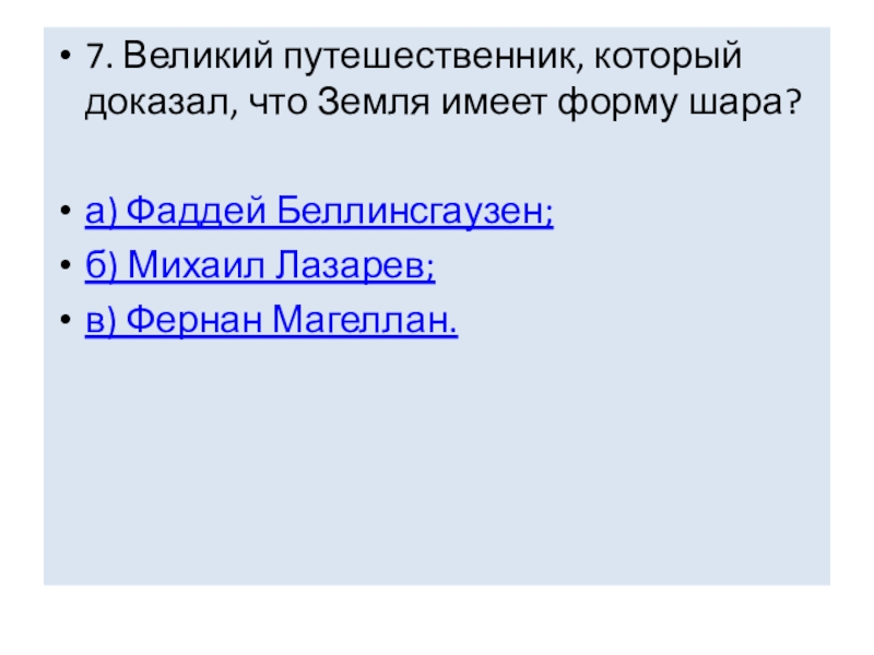 7. Великий путешественник, который доказал, что Земля имеет форму шара?а) Фаддей Беллинсгаузен;б) Михаил Лазарев;в) Фернан Магеллан.