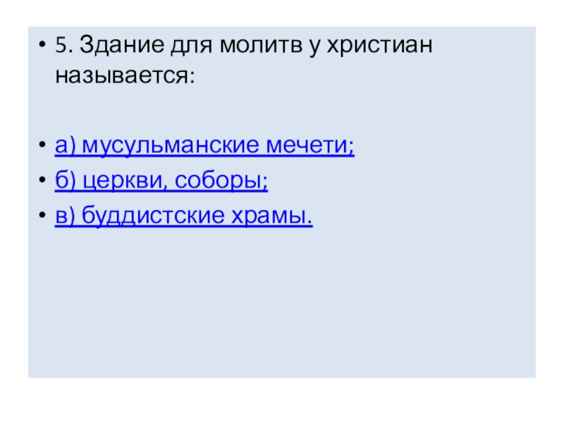 5. Здание для молитв у христиан называется:а) мусульманские мечети;б) церкви, соборы;в) буддистские храмы.