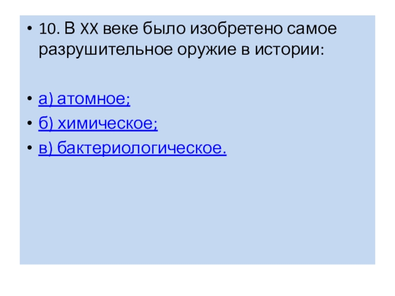 10. В XX веке было изобретено самое разрушительное оружие в истории:а) атомное;б) химическое;в) бактериологическое.