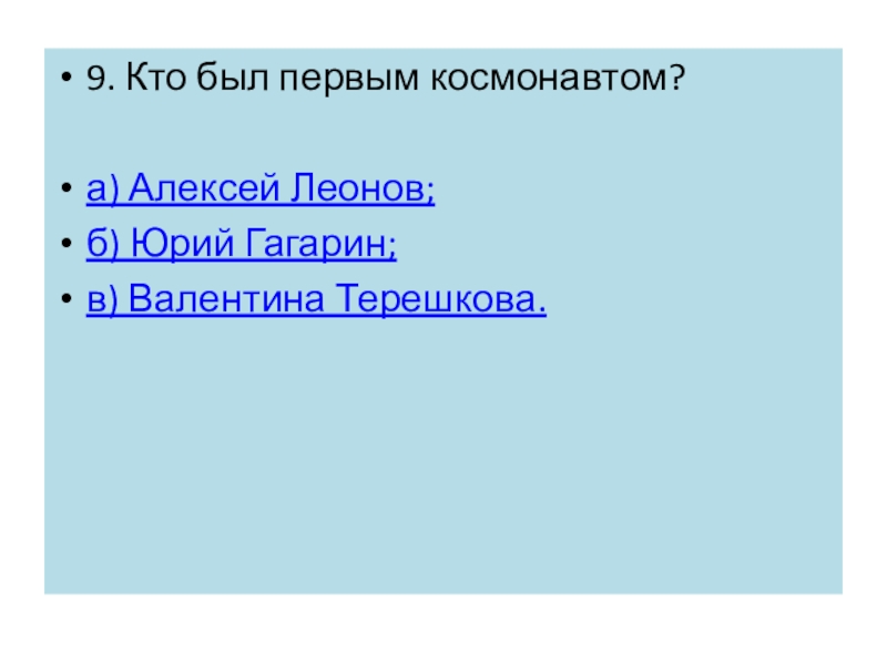 9. Кто был первым космонавтом?а) Алексей Леонов;б) Юрий Гагарин;в) Валентина Терешкова.