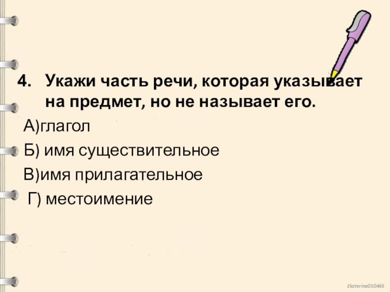 Слайд 5Укажи часть речи, которая указывает на предмет, но не называет его.