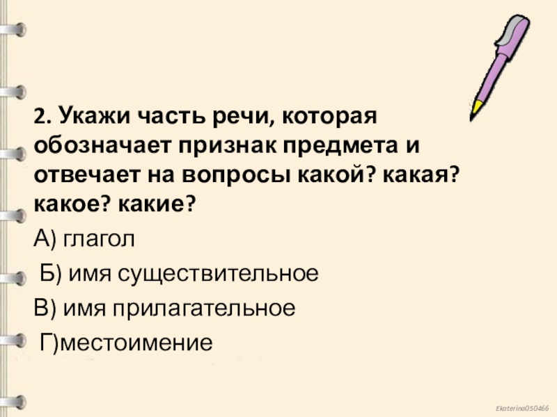 Слайд 32. Укажи часть речи, которая обозначает признак предмета и отвечает на