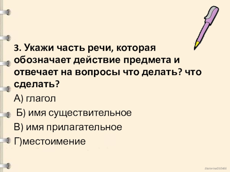 Слайд 43. Укажи часть речи, которая обозначает действие предмета и отвечает на