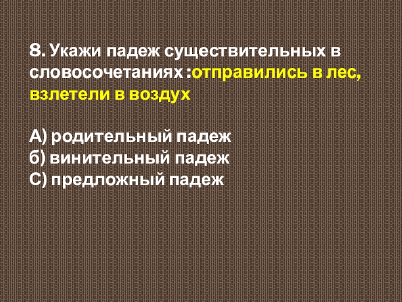 8. Укажи падеж существительных в словосочетаниях :отправились в лес, взлетели в воздух А) родительный падеж  б)