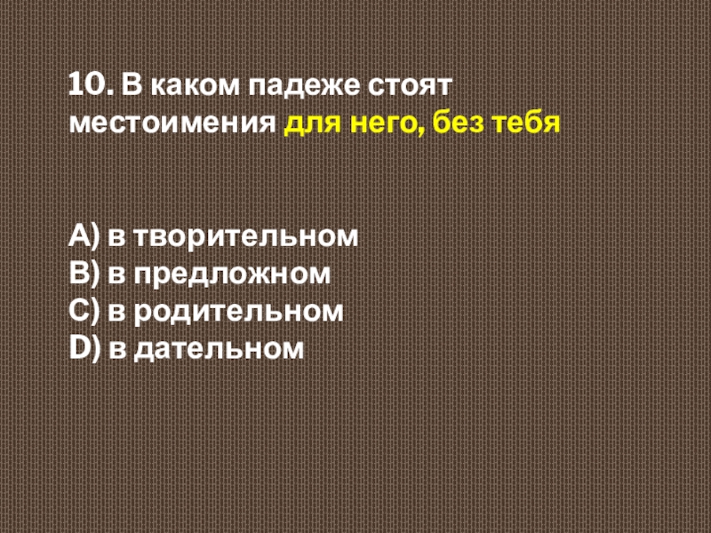 10. В каком падеже стоят местоимения для него, без тебя  А) в творительном  В) в
