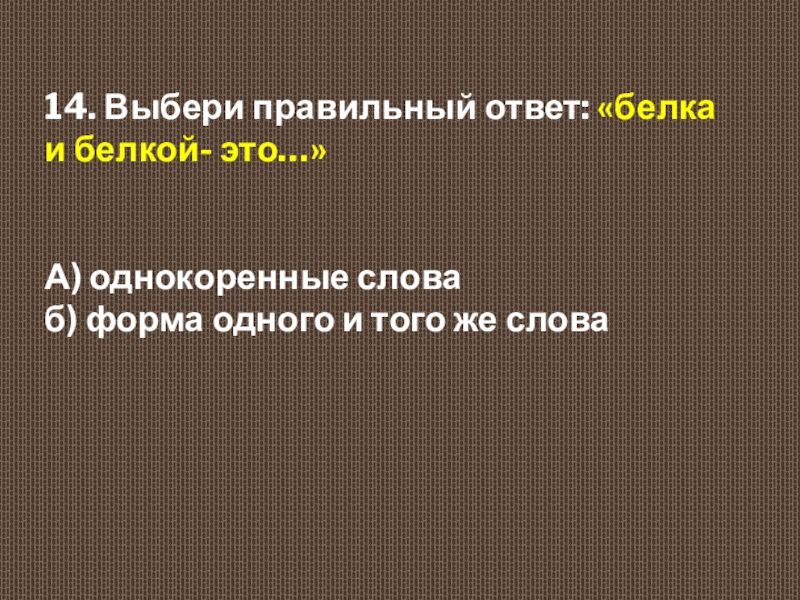 14. Выбери правильный ответ: «белка и белкой- это…»  А) однокоренные слова  б) форма одного и