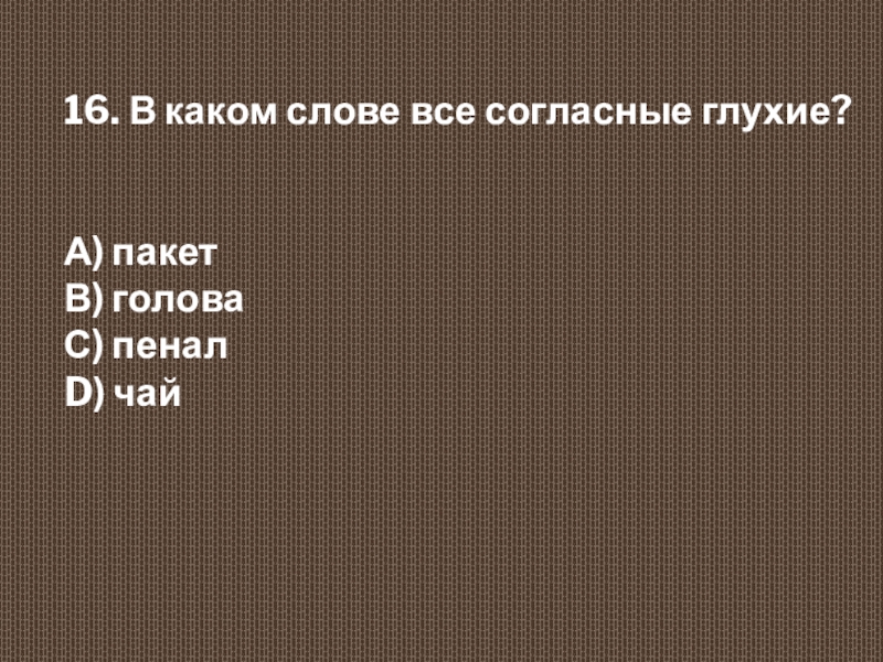 16. В каком слове все согласные глухие?  А) пакет  В) голова  С) пенал