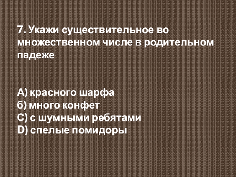 7. Укажи существительное во множественном числе в родительном падеже  А) красного шарфа  б) много конфет