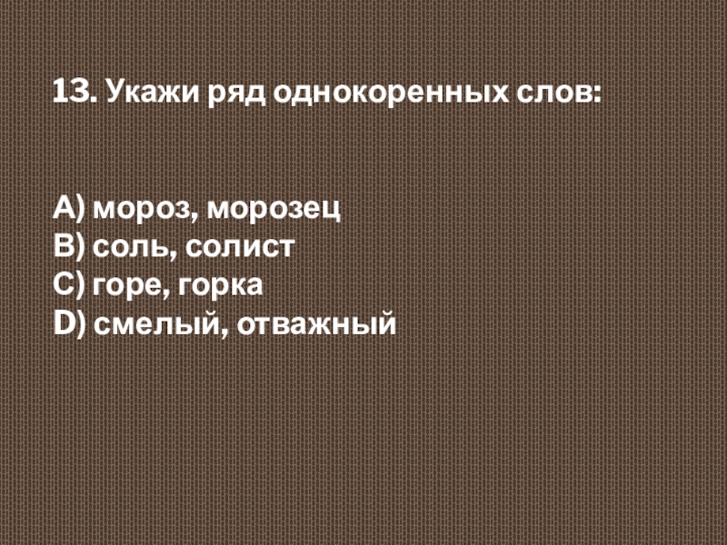 13. Укажи ряд однокоренных слов:  А) мороз, морозец  В) соль, солист  С) горе, горка