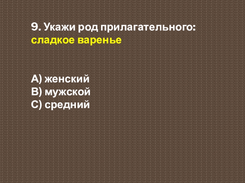9. Укажи род прилагательного: сладкое варенье  А) женский  В) мужской  С) средний