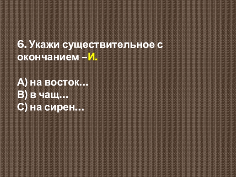 6. Укажи существительное с окончанием –И.  А) на восток…  В) в чащ…  С) на
