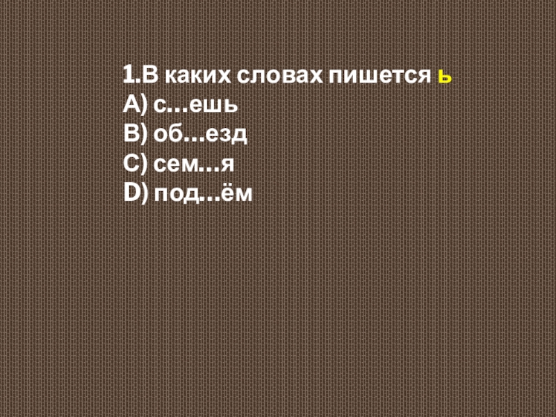 1.В каких словах пишется ь  А) с…ешь  В) об…езд  С) сем…я  D) под…ём