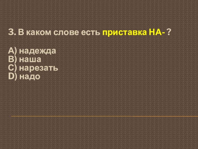 3. В каком слове есть приставка НА- ?  А) надежда  В) наша  С) нарезать
