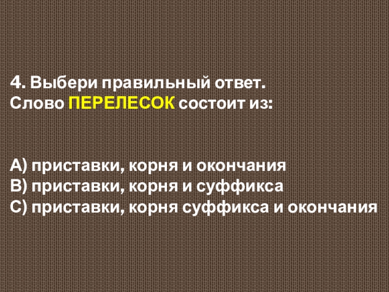 4. Выбери правильный ответ.  Слово ПЕРЕЛЕСОК состоит из:  А) приставки, корня и окончания  В)