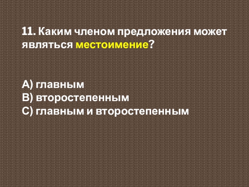 11. Каким членом предложения может являться местоимение?  А) главным  В) второстепенным  С) главным и