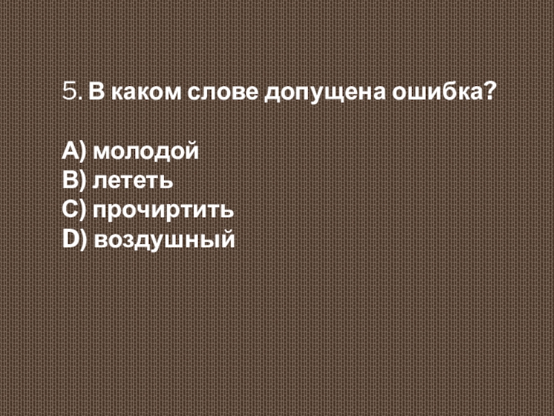 5. В каком слове допущена ошибка?  А) молодой  В) лететь  С) прочиртить  D)