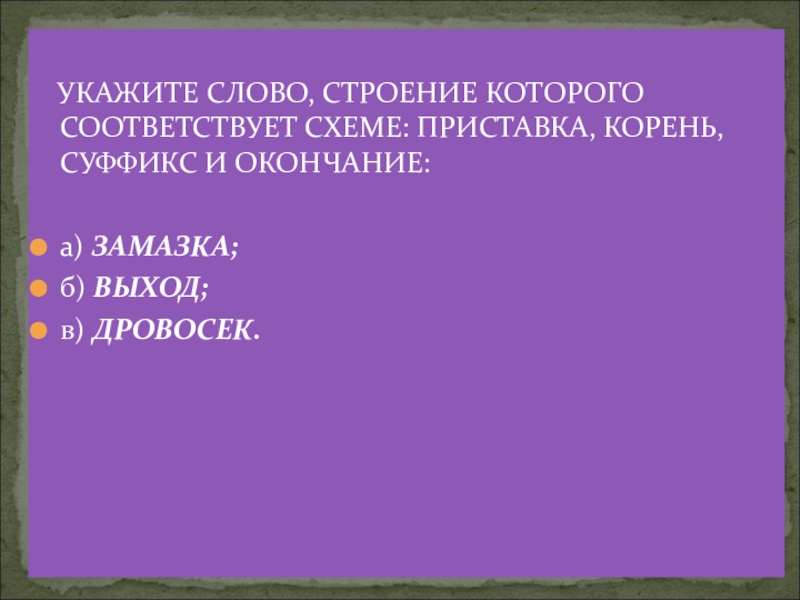 УКАЖИТЕ СЛОВО, СТРОЕНИЕ КОТОРОГО СООТВЕТСТВУЕТ СХЕМЕ: ПРИСТАВКА, КОРЕНЬ, СУФФИКС И ОКОНЧАНИЕ:а) ЗАМАЗКА;б) ВЫХОД;в) ДРОВОСЕК.