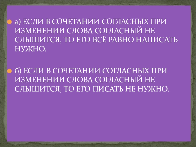 б) ЕСЛИ В СОЧЕТАНИИ СОГЛАСНЫХ ПРИ ИЗМЕНЕНИИ СЛОВА СОГЛАСНЫЙ НЕ СЛЫШИТСЯ, ТО ЕГО ПИСАТЬ НЕ НУЖНО.
