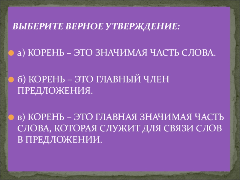 ВЫБЕРИТЕ ВЕРНОЕ УТВЕРЖДЕНИЕ:а) КОРЕНЬ – ЭТО ЗНАЧИМАЯ ЧАСТЬ СЛОВА.б) КОРЕНЬ – ЭТО ГЛАВНЫЙ ЧЛЕН ПРЕДЛОЖЕНИЯ.в) КОРЕНЬ